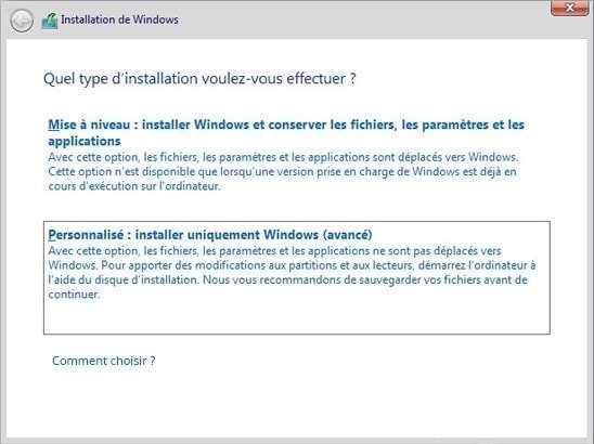 - Mise à niveau : installer Windows et conserver les fichiers, les paramètres et les applications. Cette option conservera tous les fichiers, paramètres et applications que vous avez enregistrés dans la partition système en place. Veuillez noter que ceci n'est disponible que si l'ordinateur exécute déjà une version prise en charge de Windows.