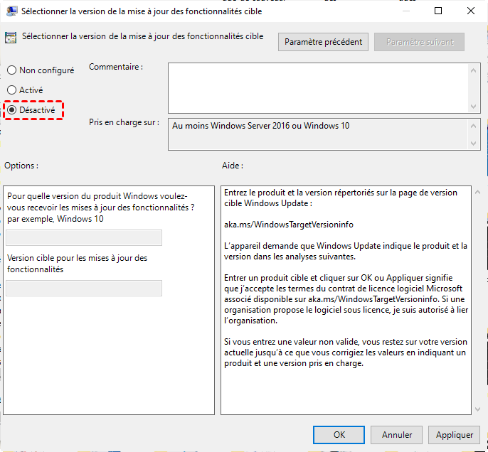 Si vous souhaitez uniquement bloquer la fonctionnalité qui vous demande de passer à Windows, vous pouvez utiliser la nouvelle politique TargetReleaseVersion ou le paramètre du registre depuis la version 1803 de Windows 10. Cela vous permet de spécifier la fonctionnalité de mise à jour à jour à rester sur ou à passer à Windows 10 que vous voulez jusqu'à la fin du service.