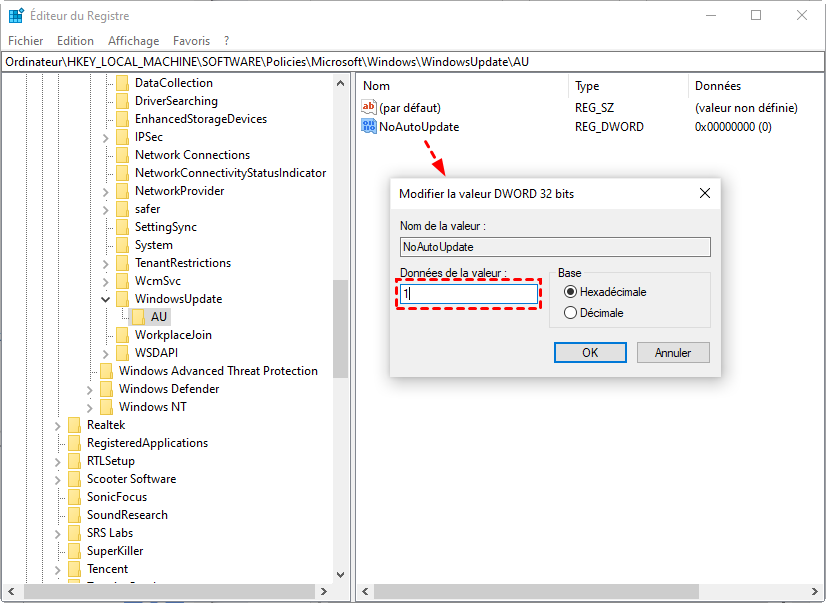 2. Dans AU, cliquez avec le bouton droit sur le panneau de droite et sélectionnez Nouveau > Valeur DWORD (32 bits). Double-cliquez ensuite dessus pour modifier le nom de la valeur en « NoAutoUpdate » et modifiez les données de la valeur de 0 à 1.