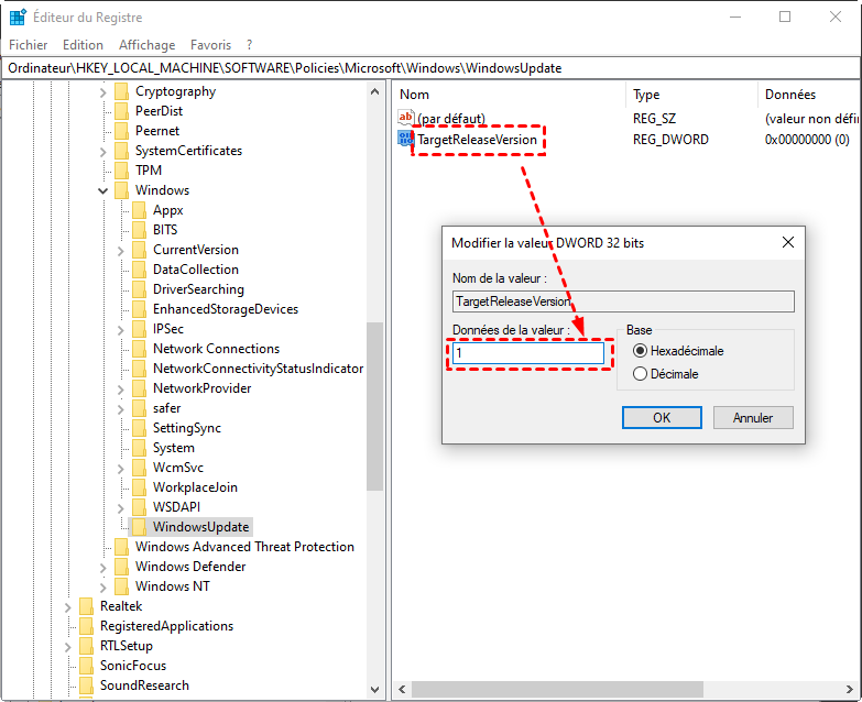 3. Ensuite, double-cliquez sur la nouvelle configuration du registre, nommez-la TargetReleaseVersion et définissez sa valeur sur 1.
