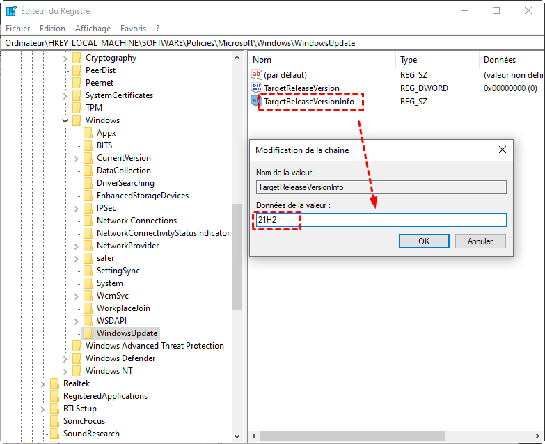 5. Créez une nouvelle chaîne en faisant un clic droit dans l'espace vide, sélectionnez Nouveau > Chaîne. Ensuite, double-cliquez dessus, nommez-la TargetReleaseVersionInfo et définissez sa valeur sur 21H2.