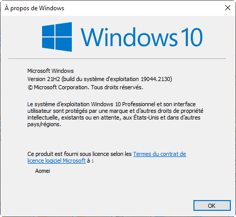 La dernière version de Windows 10 est 21H2. Avant de commencer, assurez-vous que votre ordinateur l'utilise. Tapez « winver » dans la fenêtre Exécuter et cliquez sur OK pour le confirmer. Ensuite, vous verrez la version actuelle de Windows, c'est 21H2.