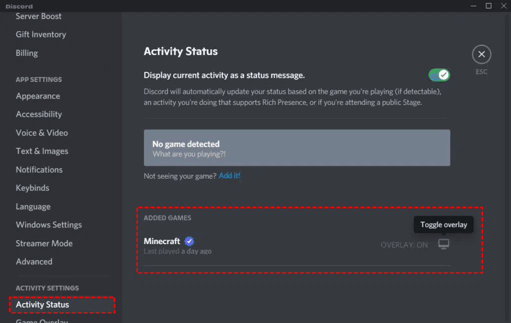Étape 4. Passez à l'onglet Activity Status pour vérifier si votre jeu a ajouté la fonction de Overlay.