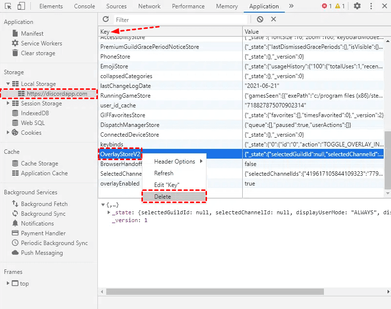 Étape 3. Cliquez sur l'entrée https://discordapp.com, recherchez le fichier OverlayStore ou OverlayStoreV2 sous l'option Clé, puis faites un clic droit dessus et sélectionnez Delete.