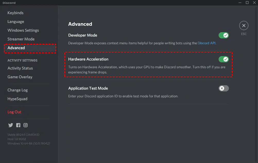 Après avoir désactivé l'accélération matérielle, redémarrez votre jeu et vous pourrez voir les paramètres Discord.