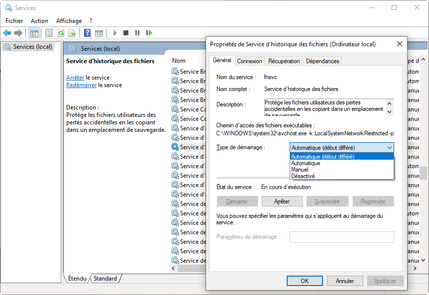2. Localisez le service d'historique des fichiers. Démarrez le service et réglez le type de démarrage en automatique (début différé).