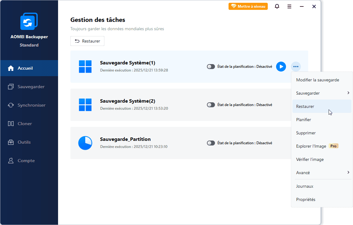 Pour restaurer à partir de la sauvegarde que vous avez créée, vous pouvez cliquer sur Accueil, trouver la tâche de sauvegarde et cliquer sur Restaurer.