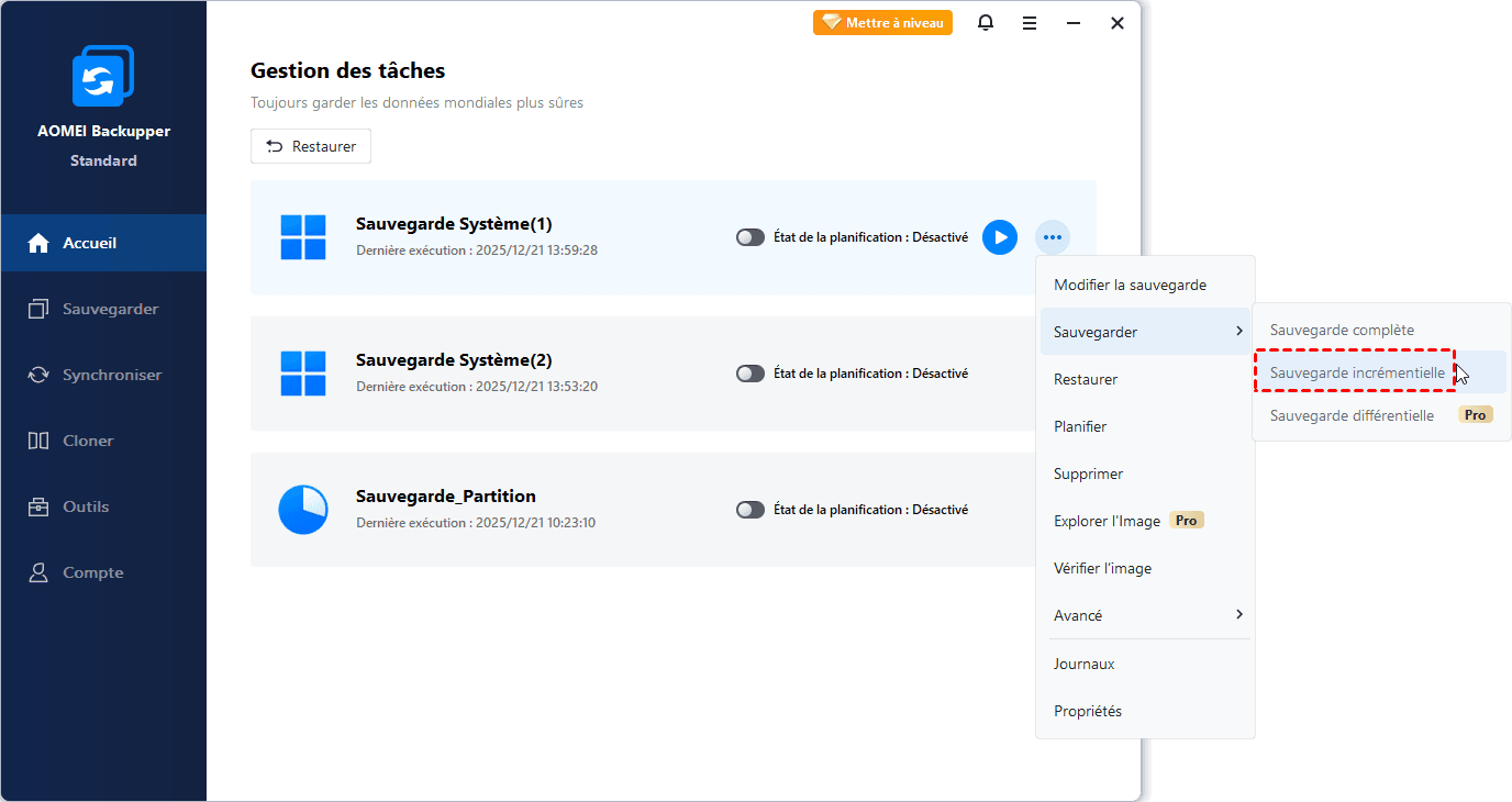De plus, ce logiciel est totalement sûr, vous n'avez pas besoin d'installer d'autres plug-ins. Comment l'utiliser ? Prenons l'exemple de la sauvegarde incrémentielle. Vous pouvez suivre les étapes simples.