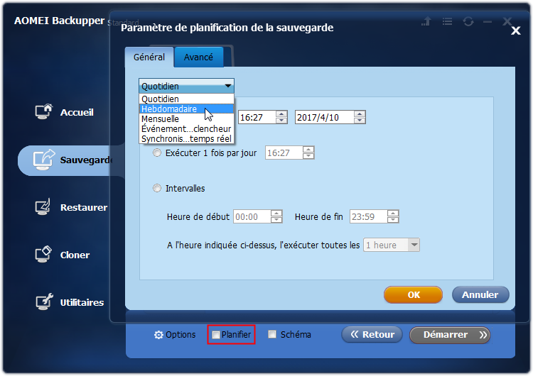 Pour créer une sauvegarde automatique, il faut cliquer sur Planifier pour la configurer.