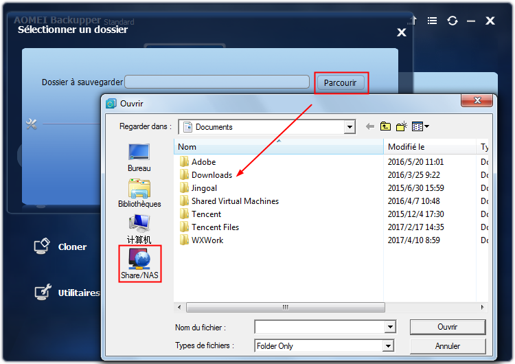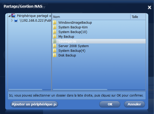 Sélectionnez le dossier que vous souhaitez sauvegarder dans la zone de liste.