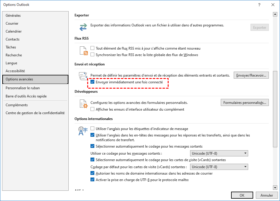 3. Faites défiler jusqu'à la section Envoi/réception et cochez Envoyer immédiatement une fois connecté. Ensuite, cliquez sur OK.