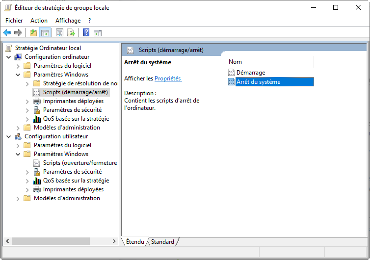 Vous pouvez aussi accéder à Configuration utilisateur > Paramètres Windows > Scripts (ouverture/fermeture de session) et sélectionnez ensuite Fermeture de session. Puis suivre le même cheminement pour exécuter un script à la fermeture de session.
