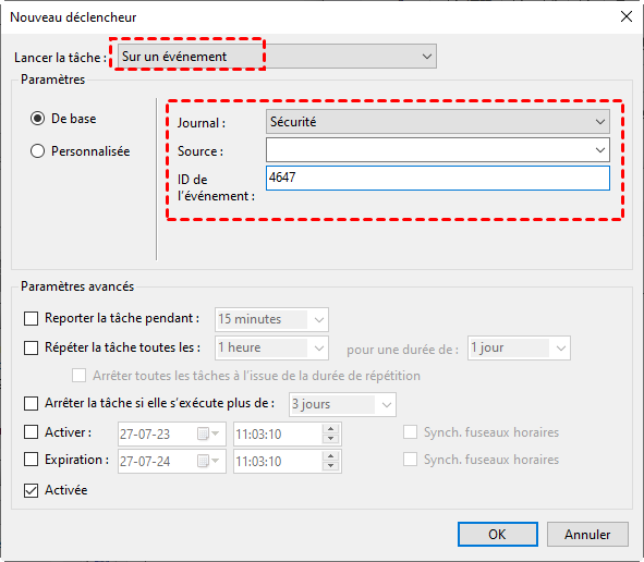 Étape 2. Cliquez sur Déclencheurs > Nouveau > Sur un événement. Ensuite, dans la section Paramètres, sélectionnez le journal Sécurité et saisissez l'ID de l'événement 4647.