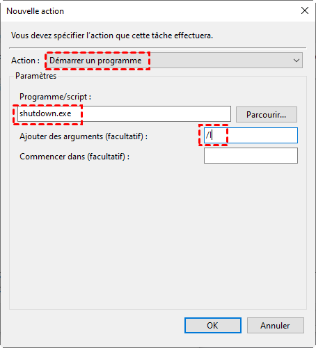 Étape 5. Cliquez sur Actions > Nouveau > Démarrer un programme. Ensuite, tapez « shutdown.exe » dans la zone Programme/script et ajoutez « /I » à Ajouter des arguments.