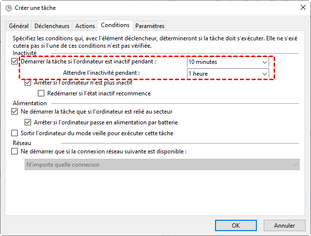 Étape 6. Cliquez sur Conditions, cochez Démarrer la tâche si l'ordinateur est inactif pendant et définissez le temps d'inactivité souhaité.