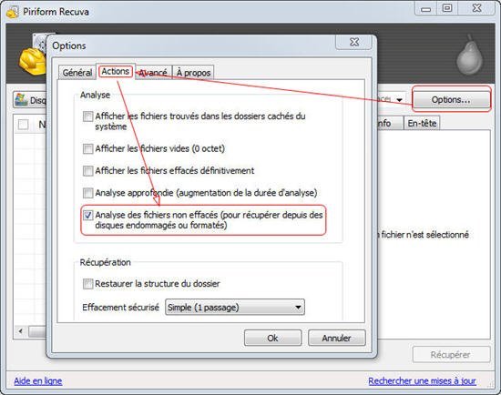 Étape 4. Scannez les fichiers sur toute la carte SD. Vous pouvez cliquer sur Options et sélectionnez l'onglet Actions, puis cochez Analyse des fichiers non effacés.