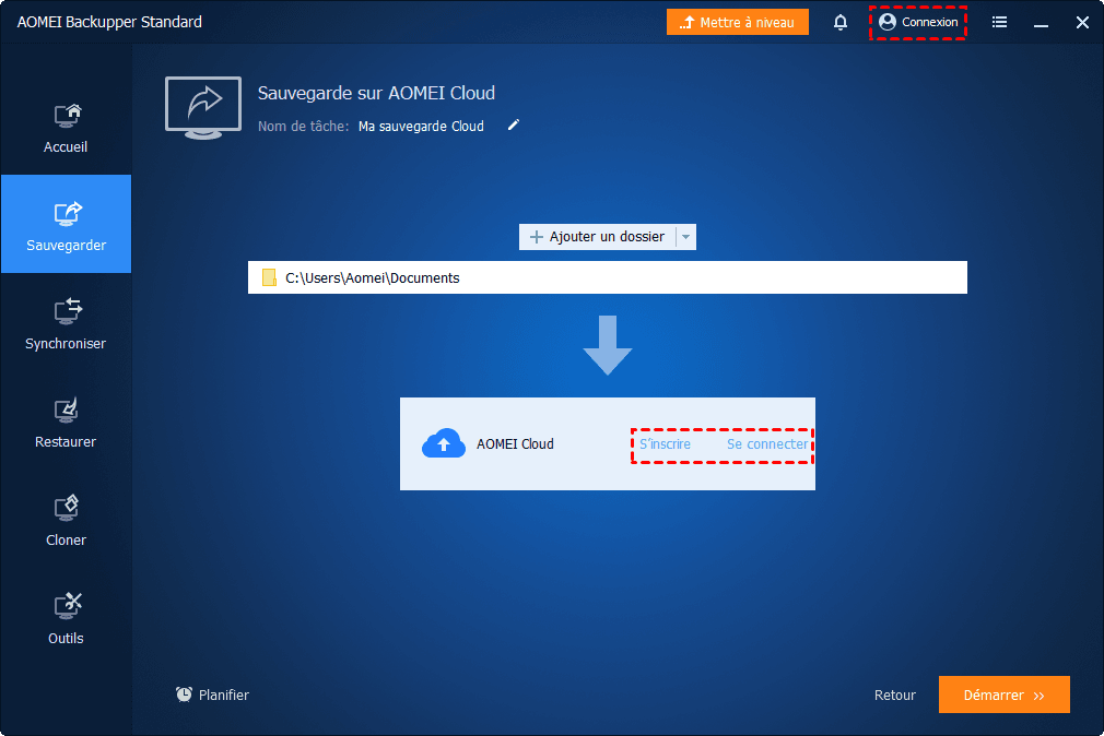 Si vous ne voulez pas occuper votre espace précieux, que diriez-vous de sauvegarder les fichiers sur AOMEI Cloud ? AOMEI Cloud est un espace cloud fourni par AOMEI Backupper, qui offre un espace jusqu'à 1 To. La seule condition requise pour en profiter est de créer un compte AOMEI et de se connecter avec le compte.