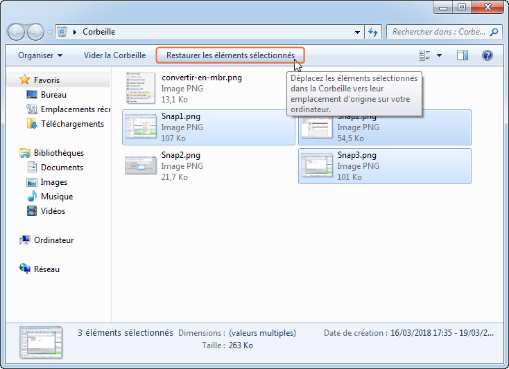 Le premier endroit à vérifier est la Corbeille. Normalement, les fichiers supprimés sont placés là pour des raisons de sécurité : Choisissez les éléments dont vous avez besoin, faites un clic droit et choisissez « Restaurer ».