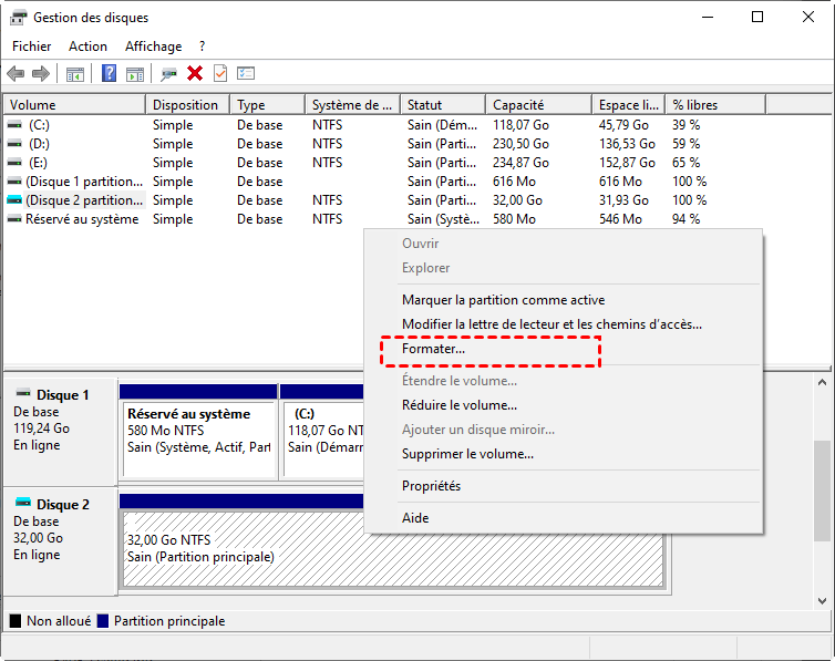 Étape 2. Sélectionnez la partition du lecteur USB, cliquez dessus avec le bouton droit de la souris et sélectionnez Formater dans le menu développé.