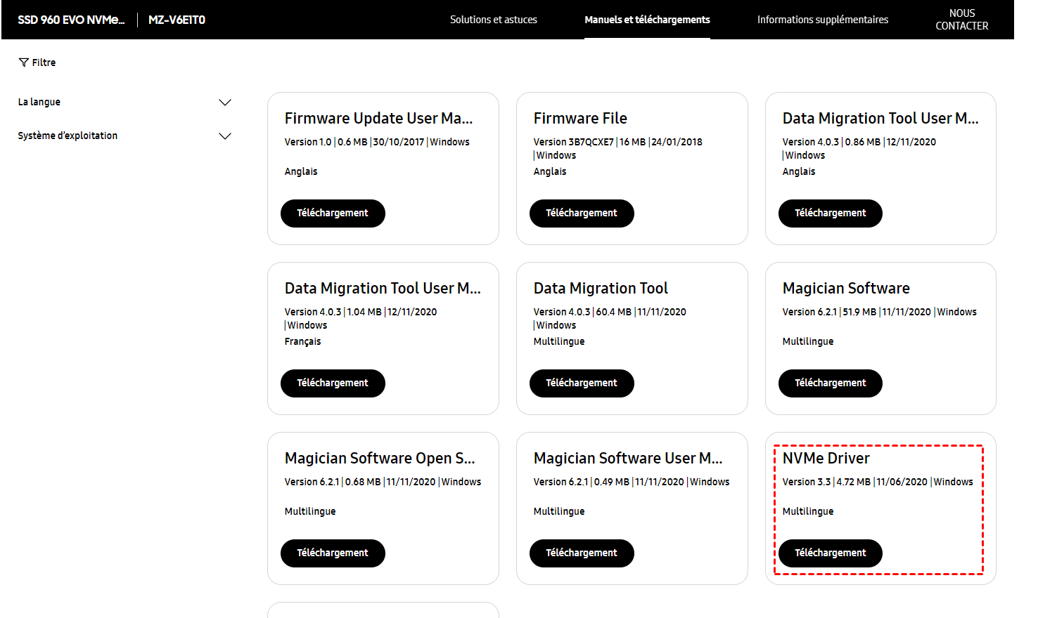 Étape 2. Faites défiler jusqu'à Manuels et téléchargements, recherchez NVMe Driver et cliquez sur Téléchargement, puis installez-le sur votre ordinateur.