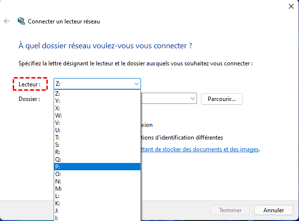 2. Dans la liste "Lecteur", sélectionnez une lettre de lecteur (Toute lettre disponible est ok).