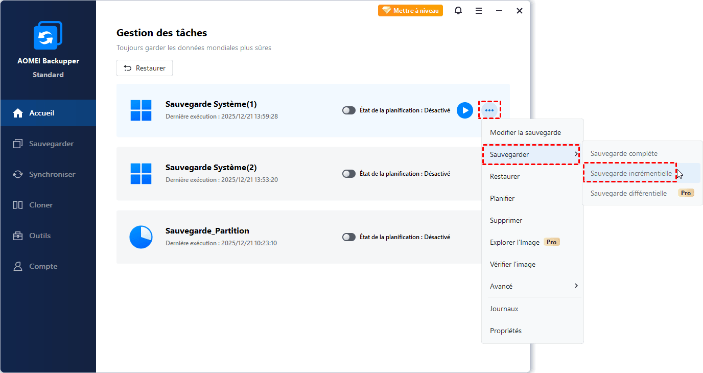 Vous pouvez modifier les tâches existantes, par exemple, configurer la sauvegarde planifiées et exécuter manuellement une sauvegarde incrémentielle.