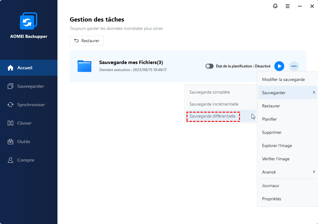 Sauvegarder uniquement les fichiers modifiés par jour automatique est très simple avec l’aide d’AOMEI Backupper. En fait, si vous souhaitez synchroniser des fichiers, vous pouvez utiliser « Synchronisation de fichiers » sous l'onglet « Synchroniser ». D'autres fonctions avancées de protection sont à découvrir, n'hésiter pas, vous avez rien à perdre.