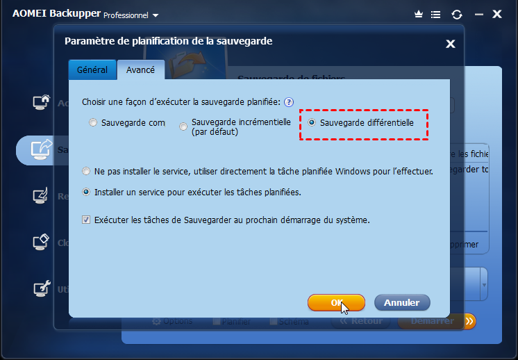 4. Sous l'onglet Schéma (vous pouvez aussi y accéder par Plan de sauvegarde) pour choisir la méthode de sauvegarde planifiée. La sauvegarde incrémentielle est définie par défaut. Pour profiter de la sauvegarde différentielle, une mise à niveau vers l'édition Professional est requise. Une fois tous les paramètres définis, cliquez sur OK.