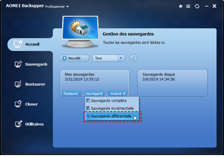 Note : Pour les tâches de sauvegarde existantes, vous pouvez le configurer directement sous l'onglet Accueil. Sur l'interface d'Accueil, cliquez sur Sauvegarder et sélectionnez Sauvegarde incrémentielle/différentielle.