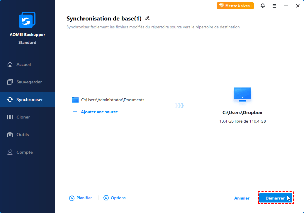 Conseil : Pour profiter de modes de synchronisation plus avancés tels que Synchronisation miroir, Synchronisation en temps réel et Synchronisation bidirectionnelle, vous pouvez effectuer une mise à niveau vers AOMEI Backupper Professional.
