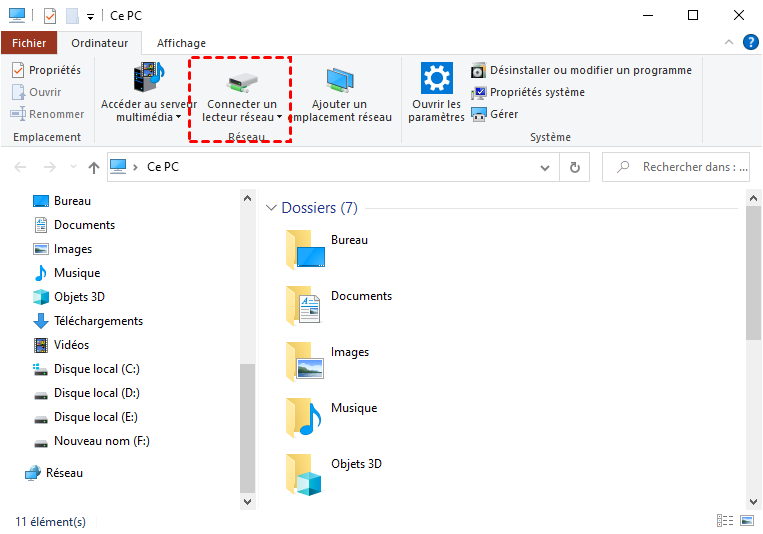 Pour créer un lecteur réseau, il suffit d'ouvrir Ce PC et cliquez sur Connecter un lecteur réseau dans le panneau en haut. Ensuite, attribuez une lettre au lecteur NAS, et naviguez jusqu'à l'emplacement NAS ou au dossier. Enfin, si tout va bien, le NAS QNAP s'affichera avec un lecteur de lettre sous l'emplacement réseau.