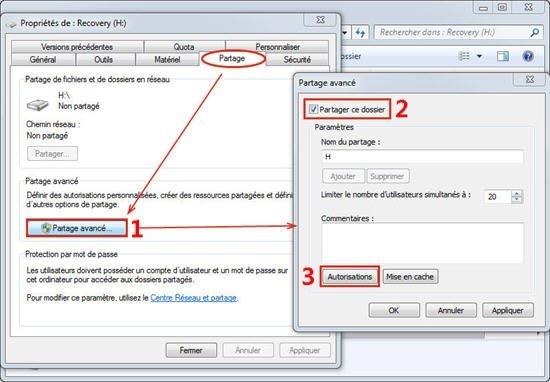 2. Dans l'Explorateur Windows, cliquez avec le bouton droit sur le lecteur de sauvegarde et sélectionnez Propriétés > Partage. Vous trouverez Non partagé sous chemin d'accès réseau. Cliquez sur Partage avancé et cochez la case Partager ce dossier dans la fenêtre contextuelle. Vous êtes autorisé commentaires d'entrée ici. Veillez à cliquer sur Autorisations.