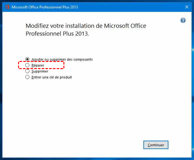 Étape 5. Dans la fenêtre Modifier, vous verrez des options telles que Ajouter ou supprimer des composants, Réparer, Supprimer et Entrer une clé de produit. Cliquez sur le bouton radio devant Réparer.