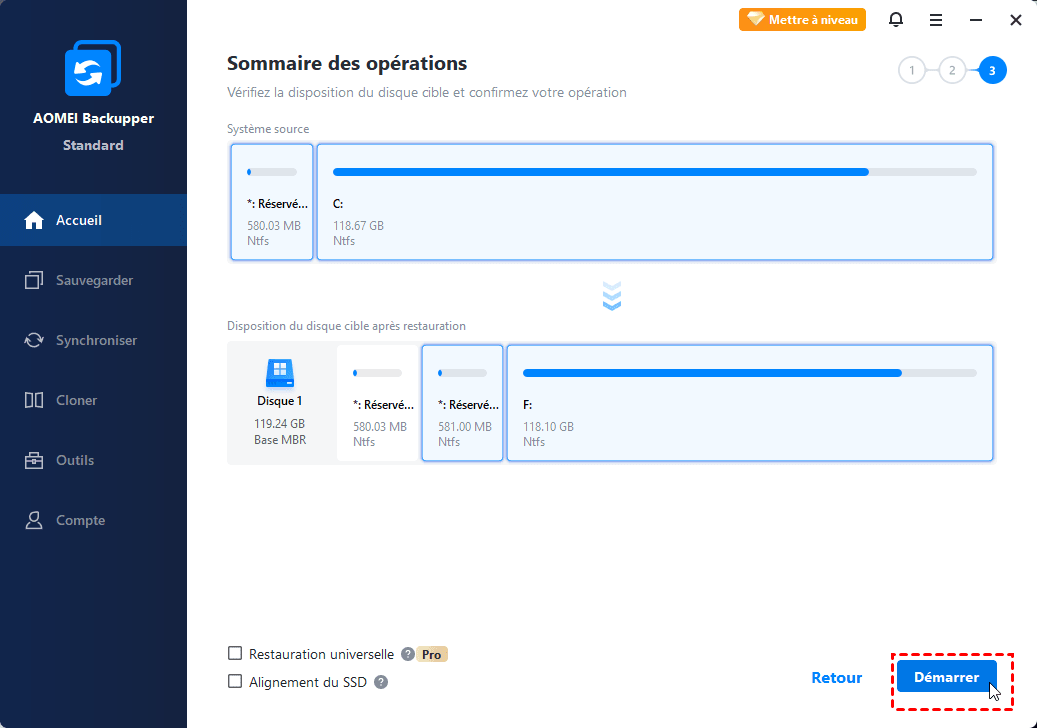 Attention : Pour être sûr qu’il n’y a pas de problème de compatibilité, il est fortement conseillé de cochez l’option Restauration universelle. Ceci nécessite une mise à niveau vers l’édition Professional.
