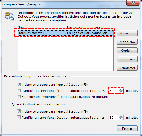 3. Vous pouvez vérifier les paramètres de « Tous les comptes » ci-dessous. Par défaut, l’option « Planifier un envoi / une réception automatique toutes les ___ minutes » est sélectionnée Par défaut. Remplacez le nombre de minutes par le nombre souhaité.