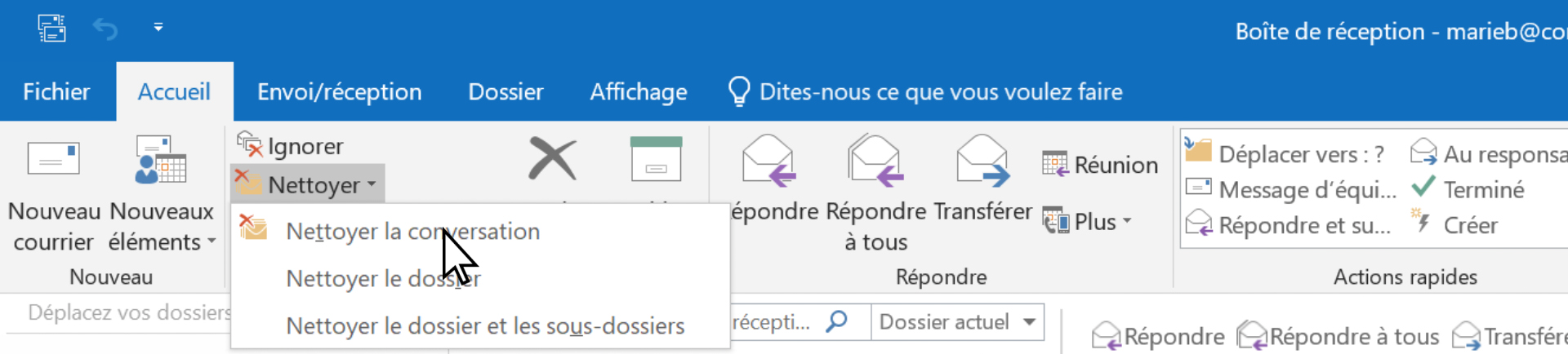 - Nettoyer les dossiers et les sous-dossiers : supprime tous les messages redondants du dossier actif et de ses sous-dossiers.