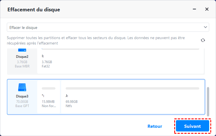 Étape 2. Vous pouvez choisir d'effacer uniquement la partition Windows, ou d'effacer tout le disque dur. Ici, on choisit Effacer le disque comme exemple pour effacer toutes les données sur le disque dur, appuyez sur Suivant >>.