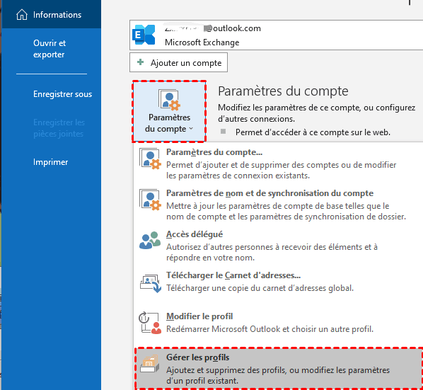 1. Dans Outlook, sélectionnez Fichier > Paramètres du compte > Gérer les profils.