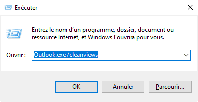 2. Tapez Outlook.exe /cleanviews puis cliquez sur OK.