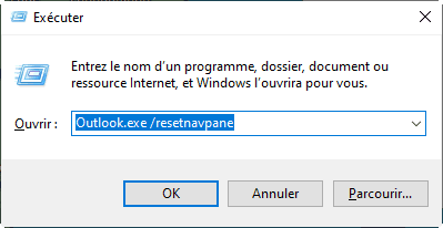 2. Puis tapez Outlook.exe /resetnavpane puis cliquez sur OK.