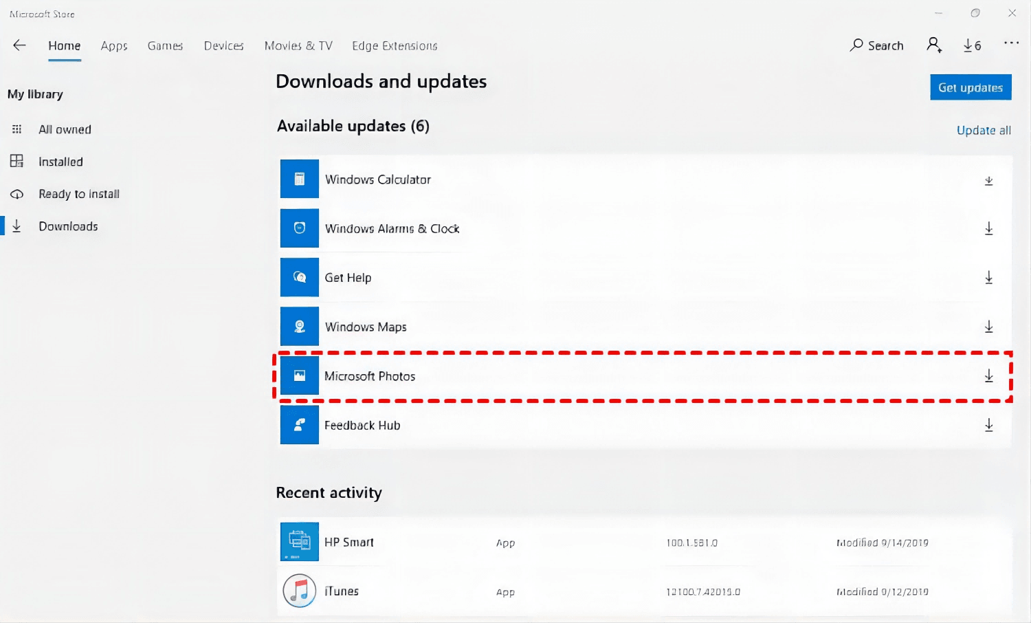 Vous pouvez aussi mettre à jour Microsoft Photos dans le Microsoft Store. allez simplement sur le Microsoft Store et cliquez sur l'icône à trois points dans le coin supérieur droit. Puis, recherchez Microsoft Photos dans la fenêtre Téléchargements et mises à jour et mettez-le à jour.