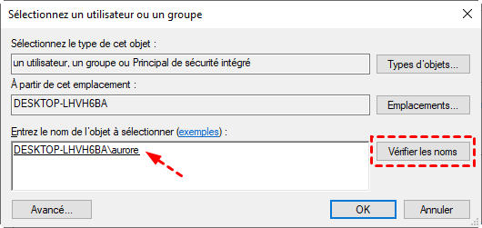 4. Sous Entrez le nom de l'objet à sélectionner, entrez le nom du compte d'utilisateur et cliquez sur le bouton Vérifier les noms, puis cliquez sur le bouton OK.