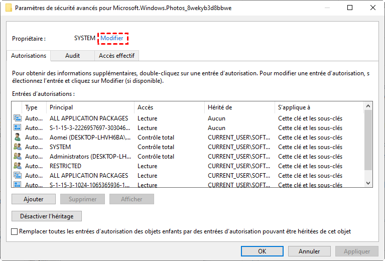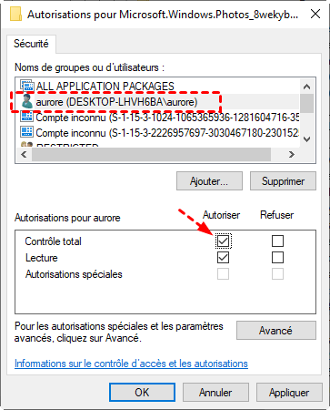 ▶ Conseils : Sous le dossier Microsoft.Windows.Photos_8wekyb3d8bbwe, vous trouverez plusieurs dossier, chacun correspond à un numéro de version. Parmi eux, le numéro de version inférieur représente l'ancienne version du projet, que vous devez supprimer. Mais avant cela, vous devez vous approprier le dossier Microsoft.Windows.Photos_8wekyb3d8bbwe. Suivez les étapes ci-dessous.