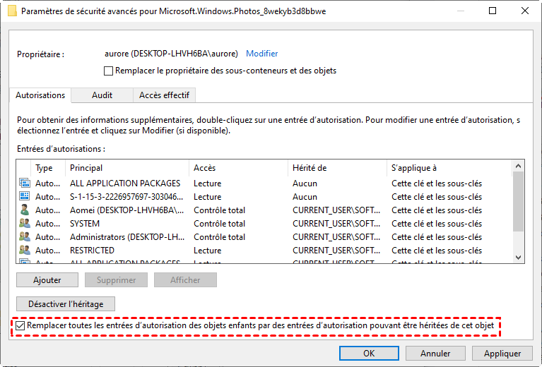 5. Sous Propriétaire, cochez la case Remplacer toutes les entrées d'autorisation des objets enfants par des entrées d'autorisation pouvant être héritées de cet objet et cliquez sur le bouton OK.