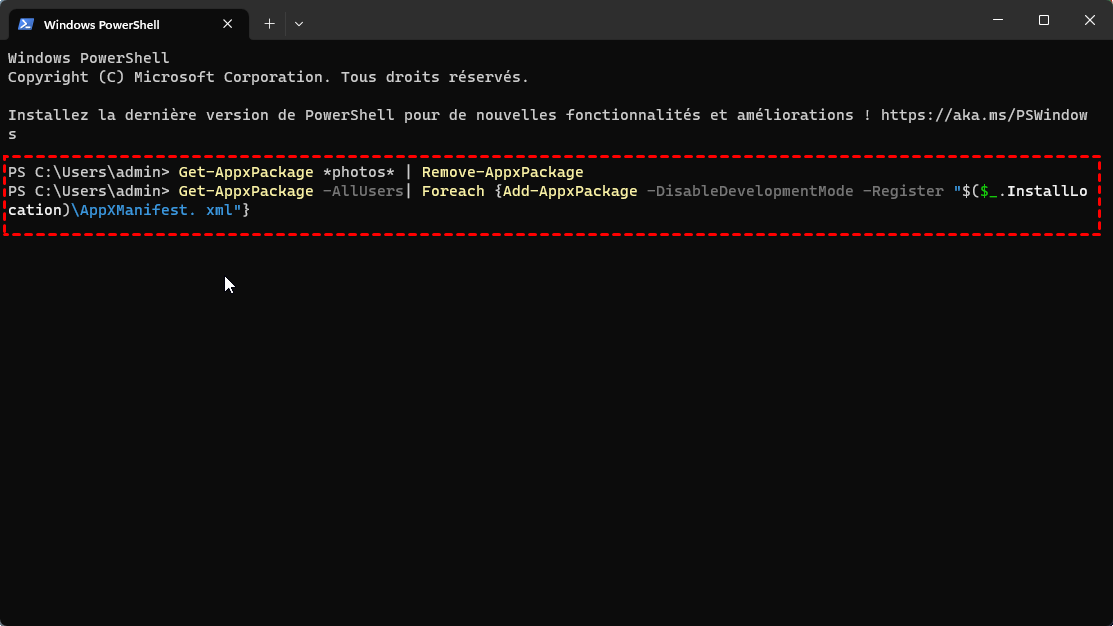 3. Réinstallez l'application de photos en saisissant à nouveau la commande suivante et en cliquant sur Enter.
