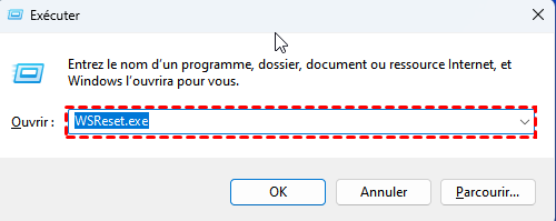 Utilisez Windows + R pour ouvrir la fenêtre Exécuter, tapez WSReset.exe et cliquez sur Enter.