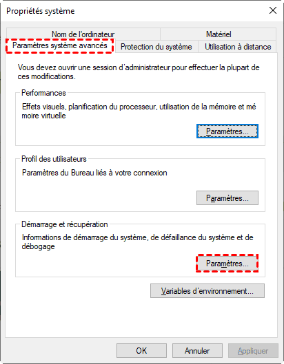 Étape 6. Sous l’onglet Paramètres système avancés, cliquez sur Paramètres sous Démarrage et récupération.