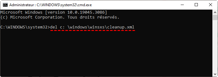 Étape 2. Tapez la commande del c: \windows\winsxs\cleanup.xml dans l'invite de commande et appuyez sur Enter pour supprimer le dossier cleanup.xml.