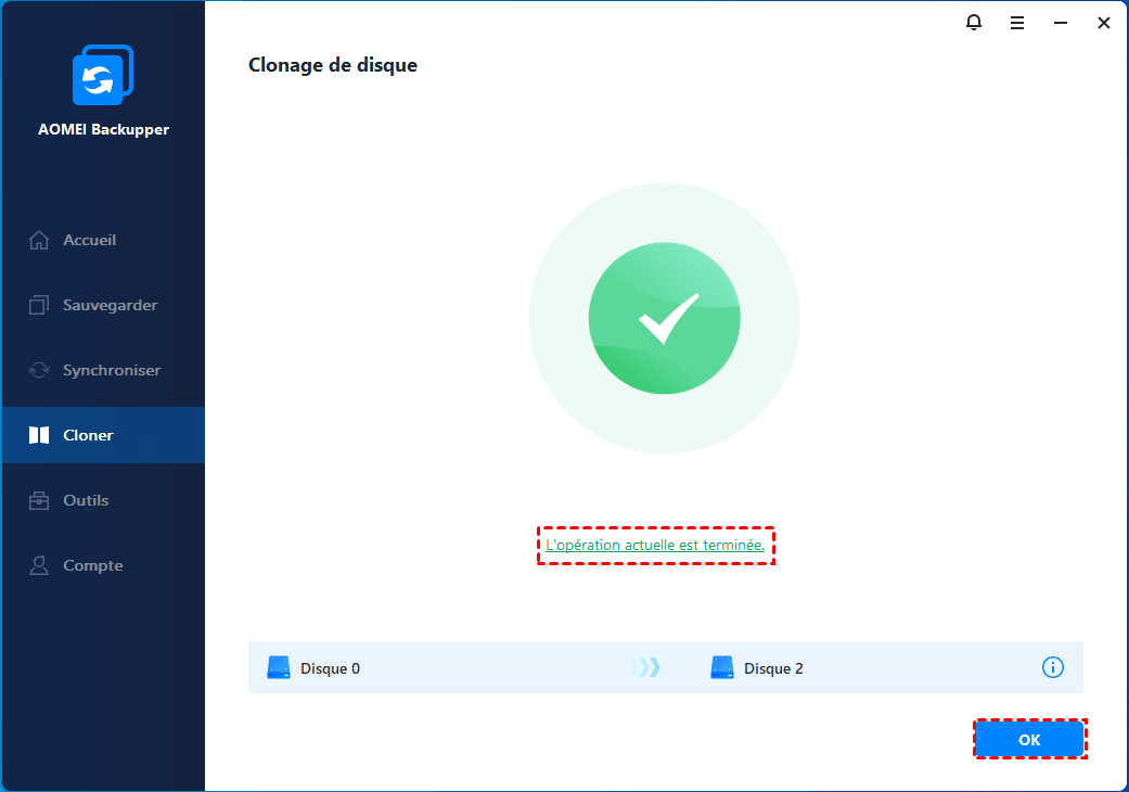 Comme vous le voyez, vous pouvez facilement cloner un disque dur sur un SSD, y compris une partition de restauration avec AOMEI Backupper.