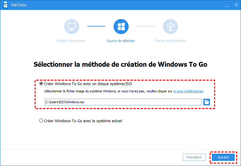 Étape 3. Choisissez le système source à installer sur la clé USB. Si vous avez un disque système ou fichier ISO Windows, choisissez la première option. Pour créer une version portable de votre PC actuel, choisissez la deuxième option.